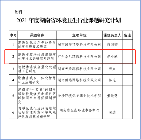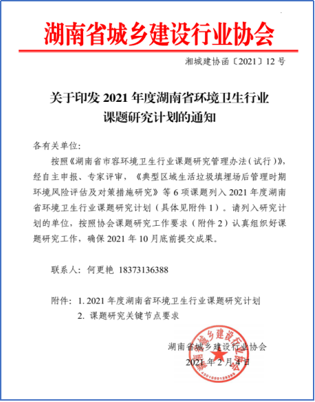 2021年2月4日,我司“高級(jí)非膜法垃圾滲濾液處理技術(shù)的研究與應(yīng)用”課題列入 2021 年度湖南省環(huán)境衛(wèi)生行業(yè)課題研究計(jì)劃。