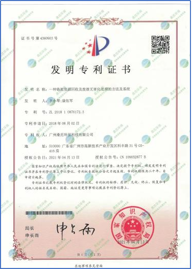 2021年5月再添2項(xiàng)授權(quán)發(fā)明專利--炸藥生產(chǎn)廢水的預(yù)處理方法及其處理系統(tǒng)(專利號(hào):ZL 201711117309.9)、一種鉻泥資源回收及廢渣無(wú)害化處理的方法及系統(tǒng)(專利號(hào):CN201810876172.3)。?